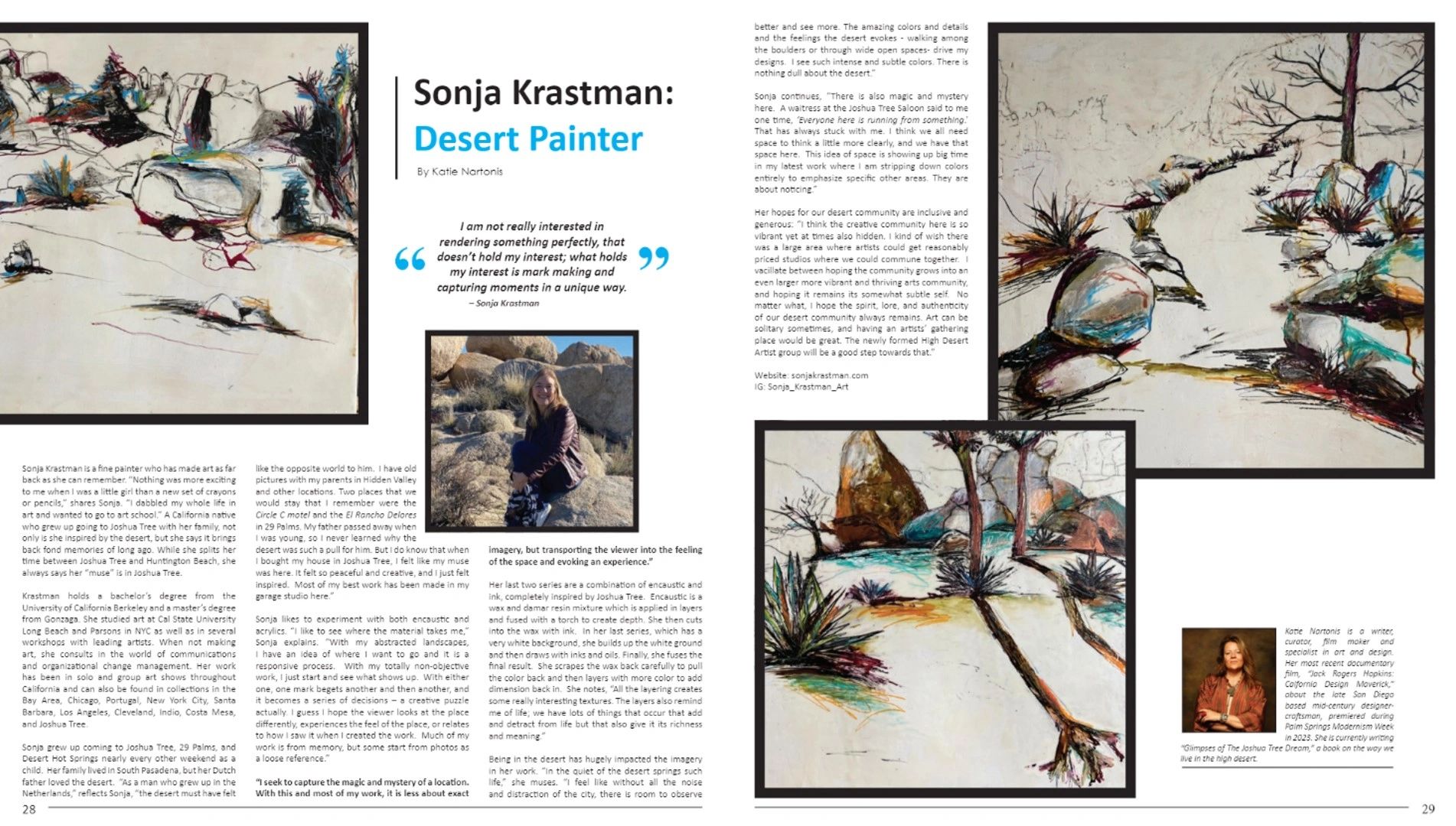 Thank you to the Joshua Tree Voice and especially Katie Nartonis for the wonderful profile . This is now part of a newly published book California Desert Artists! Thank you Katie!